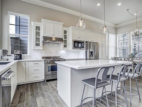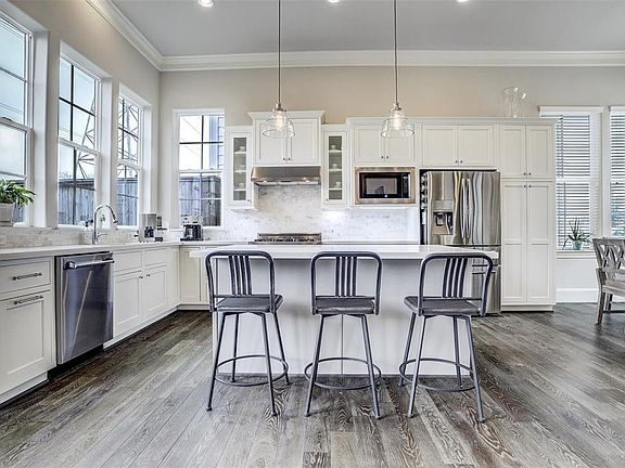 Welcome to Kolbe Farms! This amazing community offers resort style living with a serene lake, two pools, walking trails and a dog park. Fabulous 2 story home with beautiful accents, Large chef's kitchen with gas 5 burner range, Wall of windows offering lots of light, NO CARPET, YARD with artificial turf, pavers and garden, located on the GREENBELT. First floor living that boast 12 foot ceilings & engineered grey wood floors. Kitchen has an oversized quartz island, wine cooler & top of the line appliances. Includes stainless steel refrigerator, washer & dryer. Kitchen has soft close cabinets & drawers w/under cabinets lighting, Wood shutters & blinds, Spacious walk in closets, metal ceiling fans. Huge primary suite features sitting area w/ high ceilings & large bath, perfect for relaxing. Double sink w/Quartz Vanity. Nest thermostat & Wyze doorbell, Tankless water heater & Water softener. Custom mud room at garage door. Urban farmhouses, 40 acres & Security Guard at night.