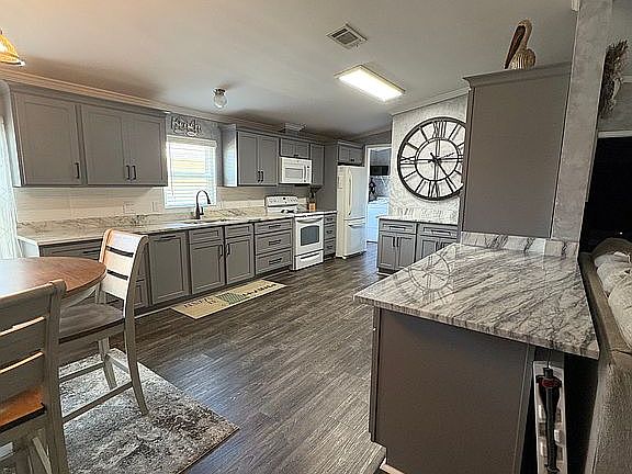 Are you looking for a vibrant 55+ Community? The Grove in Foley is the ideal location for your retirement home. This adorable 3 bedroom, 2 bath home is located on a perfect corner lot close to the pool and the clubhouse for easy access. Enjoy the beautiful sunrises and your morning coffee on the screened porch and enter an airy living space featuring modern luxury vinyl plank flooring. The updated kitchen highlights include updated cabinets, tiled backsplash, and granite countertops. Both bathrooms have tiled showers and double vanity in the primary suite. This could be just what you are looking for!!