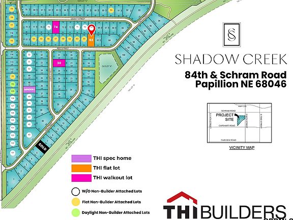 Experience the best of Papillion living at Shadow Creek, a premier new community by THI Builders, located off 84th Street in the Schram/Capehart area. This sought-after neighborhood offers easy access to Midlands Hospital, Shadow Lake Towne Center, and Walnut Creek Recreation Area, combining everyday convenience with outdoor recreation and lifestyle amenities. Choose from builder-attached lots featuring ranch and two-story floor plans, with builds starting in the low 400s and up and a minimum of 1,500 sq. ft. on the main level for ranch homes. Lot sizes average 72 to 85 ft of street frontage, offering generous space and beautiful curb appeal. Each home reflects THI’s signature craftsmanship with open layouts, designer finishes, and premium materials throughout. Located within the Papillion La Vista School District, Shadow Creek is the perfect place to call home. Our process is simple—start with a discovery call, tour and select a plan, and schedule a price-out to begin your build.