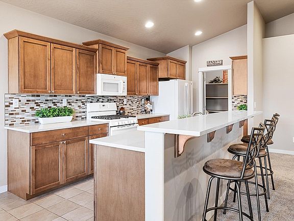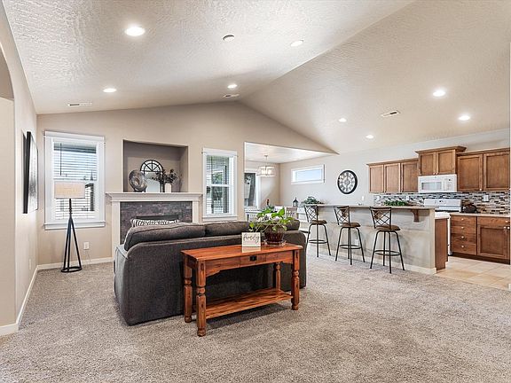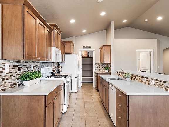 Welcome to this charming one-level home nestled in the beautiful and quiet Pillar Rock community. This rancher was thoughtfully designed with neutral colors throughout. 4 bedrooms and 2 bathrooms provide extra space for family members, guests, or added office space. The heated 3-car garage is great for an extra vehicle, work shop area, or extra storage. Step inside, and you'll be immediately captivated by the open great room, cozy fireplace, and spacious galley kitchen with a large walk-in pantry for all your extras. The primary bedroom has a large soaker tub for those long days in addition to a convenient separate shower, double sinks, and a generous walk-in closet. Enjoy relaxing or entertaining in your oversized fenced backyard with a side deck off the garage and great storage for extras in storage shed. Lot’s to love about this home.