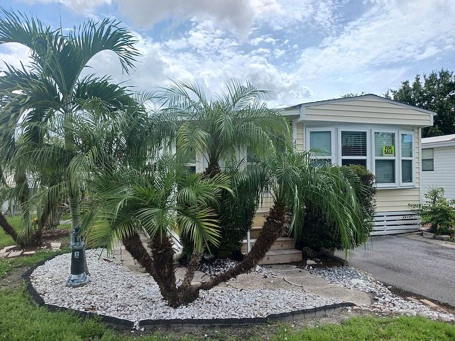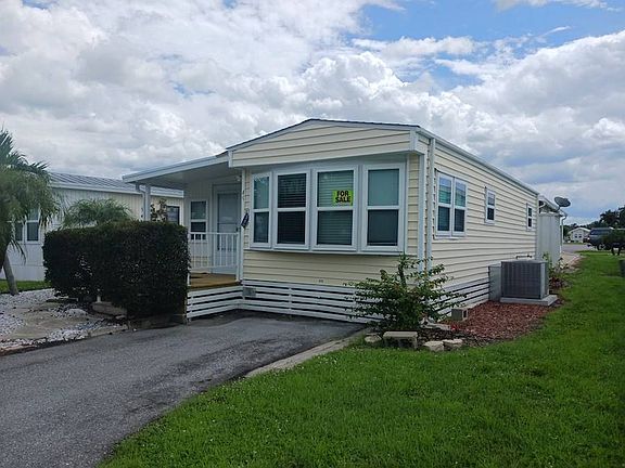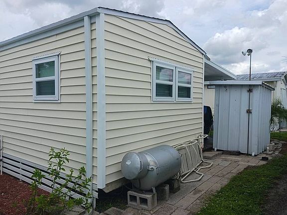 This 1986 manufactured home (20'x38',1 bedroom,1bathroom) features a large front and back porch and an extra storage shed. The kitchen has a large refrigerator, gas stove, and pantry. The home has central air and heat updated 2022. Full sized water heater replaced and moved to laundry area in 2010. carpet in additional room replaced 2022, laminate in in rest of home. Roof is 1/2 metal roofover and the rest shingled, all replaced in 2022. Siding is vinyl. The "additional" area can be re-figured to use for a second bedroom. It is being sold fully furnished, ready to move in. Just bring your toothbrush and a change of clothes!! Fiesta Grove, a 45+ park, has a low lot rent of $756.67 (includes fire tax) per mo. and all the amenities a "SNOWBIRD" or permanent resident could want, everything from a heated pool, horseshoes, shuffleboard and petanque for friendly competition, to bingo, ice cream socials and breakfast gatherings. You will also be welcomed to many hobby groups such as knitting, crocheting and card games. The park is pet friendly and located just minutes from the Gulf beaches. Everything you need to enjoy "THE GOOD LIFE" in Florida. It has a low sticker price, low park rent and a friendly community allowing you to "OWN" even if you have a limited budget!! It can yours, subject to park approval!!!