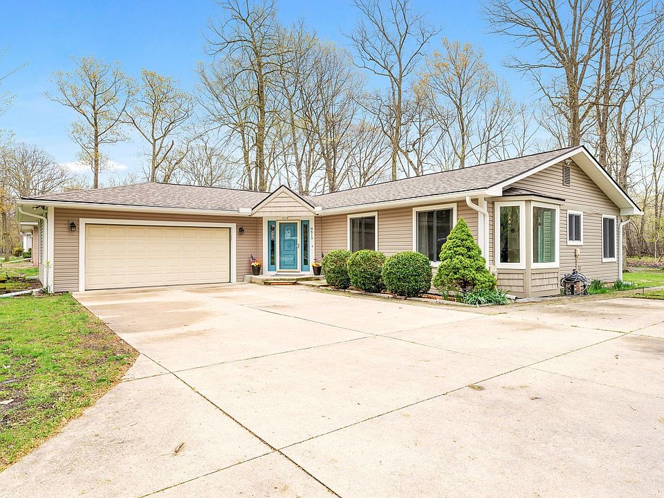 Welcome home to your nature paradise! Enjoy island living in this fantastic well maintained 1900 sf ranch nestled on a large lot, that backs up to Township-owned greenspace. This home features lots of natural light and an abundance of closet space. A welcoming and spacious ceramic-floored foyer opens into the living room and formal dining area encompassed by a large bay window. The spacious eat-in kitchen offers plenty of cabinets and counter space, and another bay window overlooking the serene, nature-filled backyard. All the appliances are included. The roomy family room boasts a stone fireplace and new doorwall leading to a huge deck with plenty of seating, great for relaxing or entertaining this summer. Enjoy viewing the blue sky and sunshine thru the skylight in the large en-suite which includes 3 spacious closets, one being a walk-in. This full bathroom includes a long vanity area to sit at. The home also features a large open unfinished basement (just waiting for your finishing touch), with a workbench and glass block windows. The attached 2-car garage has a newer electric opener. The large driveway offers plenty of parking space. Updates include a new roof and skylight with A 50-year transferrable warranty (2018), doorwall and all windows replaced (2018) with Wallside’s transferrable warranty, 1 Pella Bay window (2018), vinyl siding and oversized commercial-grade gutters and downspouts with gutter guards (2018), hot water tank (2019), concrete front porch (2018), garage door opener (2018), and exterior lights (2018).