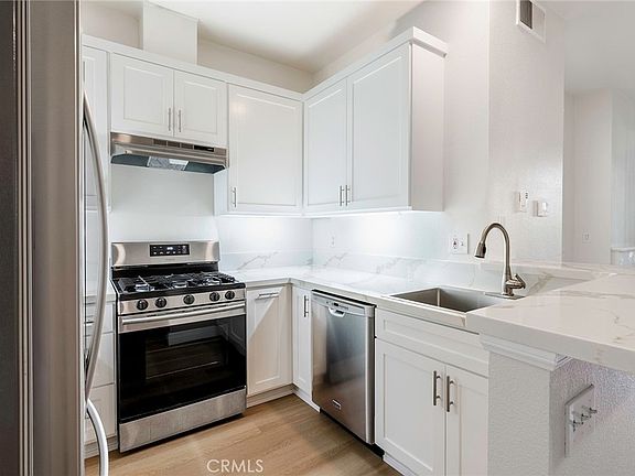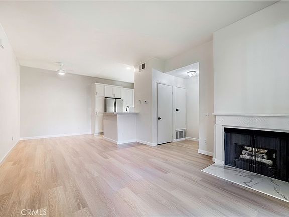 Beautiful home in Garden Grove with Scenic Pond Views and Resort-Style Amenities. This 1-bedroom condo is one of the best-priced units in Garden Grove. Attention to detail abounds with a brand-new kitchen featuring quartz countertops, new cabinetry and stainless appliances. This home has both a countertop bar and dining area for meals. The living room features a gas fireplace, perfect for cozy evenings. The upgraded bathroom features a new double-sink vanity and a private toilet. The bedroom is generously sized, complete with a walk-in closet, and the home is outfitted with new wood style flooring. The washer and dryer are located in their own dedicated area. Central AC and heating, ensuring year-round comfort. With direct access to a large patio from both the living room and bedroom, enjoy park-like views of the pond and check out the fish and ducks too. This gated community includes a pool, hot tub, tennis courts, and a clubhouse, all just a short walk away. There’s also abundant guest parking and a two-car garage with remote access, and a locking storage room off the patio adds convenient storage. Surrounded by lush landscaping in a garden-like setting, this peaceful condo has one of the best locations in the community.