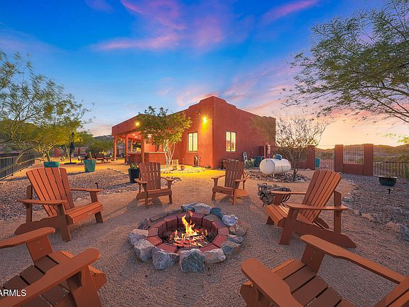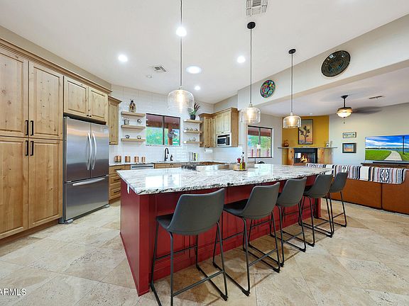 Experience luxury living on a scenic Goodyear property in close proximity to State Trust Land with horse and hiking trails just beyond your gate. This custom home features a 2022 gourmet kitchen remodel with new cabinets, appliances, lighting, and granite countertops, plus wood beam accents, travertine flooring, and a cozy fireplace. Enjoy a wrap-around patio with mountain views, a brand-new 2025 outdoor BBQ kitchen, two horse stalls with turnout, tack room, hay storage, and RV hookup. Step inside to find timeless finishes and thoughtful updates throughout. The open layout showcases arched doorways, wood beam ceilings, and travertine flooring that extends through the main areas and den, perfect for an office, gym, or game room. The eat-in kitchen was fully remodeled in 2022 with over $60,000 in upgrades, including new cabinetry with pull outs and soft close drawers, granite counters, stainless appliances, beverage fridge by coffee station and modern lighting. A large island anchors the space and provides plenty of room for cooking, entertaining, and gathering.