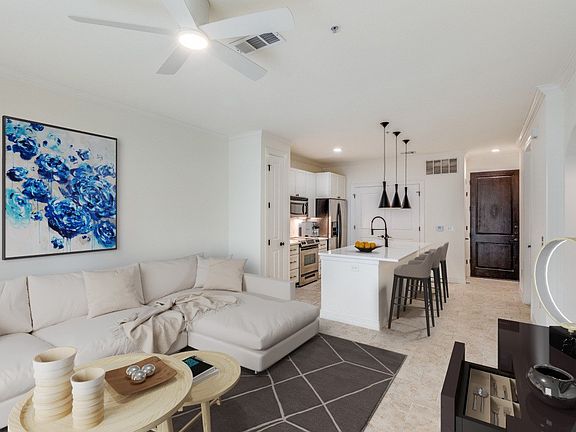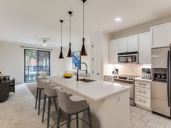 Private patioSleek stainless steel appliancesWasher and dryerPendant lightingCoat closetBreakfast barAbundant cabinet space