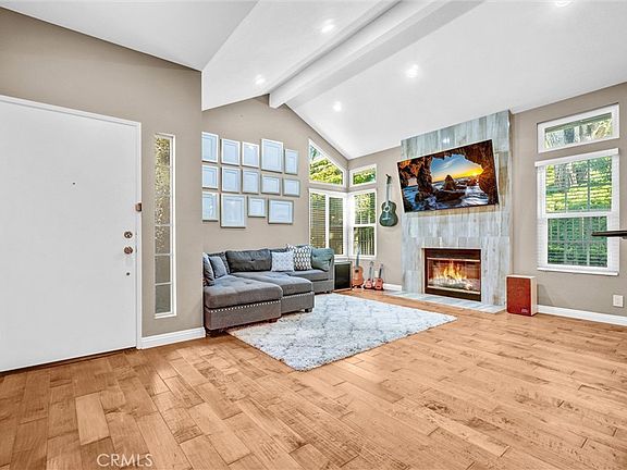 The bright, open-concept layout also features vaulted ceilings, hardwood flooring, designer-styled fireplace, and recessed lighting. The heart of the home is the gourmet kitchen, featuring sleek granite countertops and stainless-steel appliances. The kitchen effortlessly overlooks the spacious dining and living area which is perfect for both daily living and entertaining.