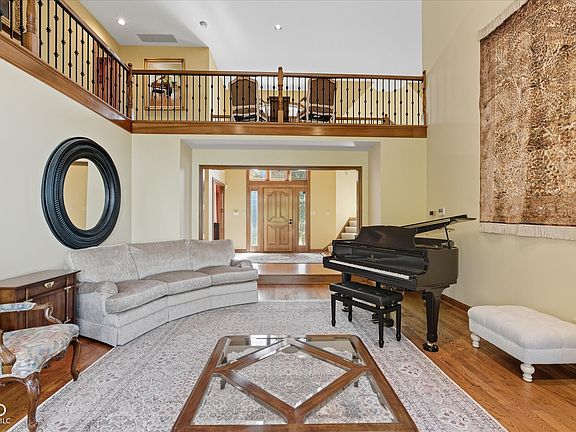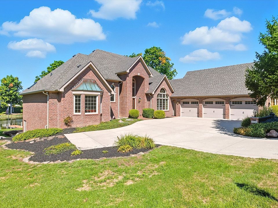 Discover lakeside living at its finest in this stunning 5BR, 4.5BA home with 100' of shoreline on a .40-acre lot with mature trees. This home offers the perfect blend of luxury, comfort, and outdoor entertaining. The main level features rich hardwood floors, a spacious great room with lake views, a formal office with built-ins, and a main-level primary suite with two walk-in closets, luxurious full bath and a door to the main level deck. The gourmet kitchen is equipped with granite countertops, stainless steel appliances, custom cabinetry, a breakfast bar, and a breakfast nook with views of the lake. A hearth room with fireplace, wet bar and door to a 3-season sunroom. The 3-season sunroom offers beautiful lake views and a door to the deck with stairs leading to a large patio-ideal for outdoor dining, music, and sunset views. Upstairs you'll find a private ensuite bedroom and two additional bedrooms connected by a Jack & Jill bath. The walkout lower level lives like a second home with a 5th bedroom, full bath, den, rec. room, wet bar, and family room with fireplace. An unfinished area with double doors to the backyard is perfect for a workshop, storage, or hobbies. Outside, enjoy direct access to the reservoir from your private dock with space for 4-5 boats. Whether you're entertaining guests or enjoying peaceful mornings on the water, this home offers year-round comfort, function, and a true lakeside lifestyle.