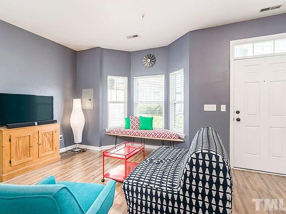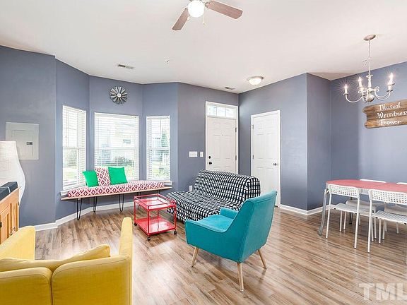 Fantastic Raleigh condo. Close to 540, shopping & restaurants & Triangle TC. Private front entry. Freshly painted. New LVP flooring. Enter into first floor w/ bay window, family & dining, & kitchen. Kitchen has great storage & counter space, some SS appliances, & view to other living areas. Second floor boasts two guest rooms w/ laundry & full bath. Third floor has private, large, master suite w/ brand new carpet, tall ceilings and on suite bath; dual vanities, separate shower, & tub. Assigned parking.