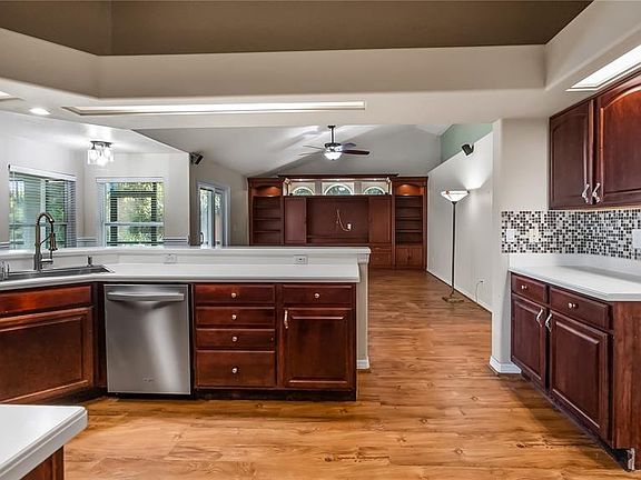 Welcome to your dream retreat in this exceptional golf course community where luxury living meets remarkable affordability! This stunning brick home sits majestically high on a hill, positioned to capture amazing natural breezes while offering captivating views of golfers perfecting their game right from your charming front porch. With an incredibly low HOA of just $150 per year and affordable golf memberships available at several levels, this community offers an unparalleled lifestyle without breaking the bank. This beautifully designed pool home features three spacious bedrooms, two full baths, plus a dedicated office for working from home or pursuing creative endeavors. The thoughtful split bedroom floor plan ensures maximum privacy, with expansive primary suite serving as your personal sanctuary. Go directly from the primary bedroom onto the screened lanai and out to your sparkling pool, creating a seamless indoor-outdoor flow that's ideal for starting your mornings with a refreshing swim or ending evenings under the stars. The primary bath features dual sinks for busy mornings, a luxurious garden tub ideal for long relaxing soaks, and a separate shower. Soaring vaulted ceilings throughout the home create an impressive sense of space and elegance, while abundant natural light fills every corner. The heart of this home is the spectacular kitchen, boasting tons of cabinet space for all your culinary tools solid surface counters that provide style and durability. The open layout allows you to overlook the inviting family room while preparing meals, making it easy to stay connected with loved ones. The family room showcases a newer custom-built entertainment center complete with shelving, a dedicated space for speakers and even a clever pullout drawer designed specifically for your record player, letting you enjoy your treasured vinyl collection in style. French doors with built-in blinds lead from the family room to the screened lanai, where you can relax in comfort while enjoying your private backyard oasis. Fire up the grill for weekend barbecues, host unforgettable gatherings with friends and family, then cool off with a refreshing dip in your pool. The screened enclosure ensures you can enjoy outdoor living year-round. For more formal occasions, the home offers a gracious living room and a dining room with attractive built-in shelving, ideal for displaying treasured collections or hosting elegant dinner parties. The convenient side entry garage adds practicality and curb appeal to this impressive brick home. Roof 2016 and new windows in 2017! This is more than just a house, it's a lifestyle opportunity in a fabulous community where neighbors become friends and every day feels like a vacation. Don't miss your chance to own this exceptional property.