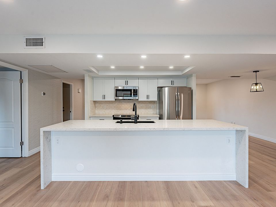 Inside, you'll find an open-concept floor plan with new flooring throughout, creating a bright and seamless flow between living spaces. The chef's kitchen features quartz countertops, bold black finishes, and premium stainless steel appliances perfect for everyday cooking and entertaining.