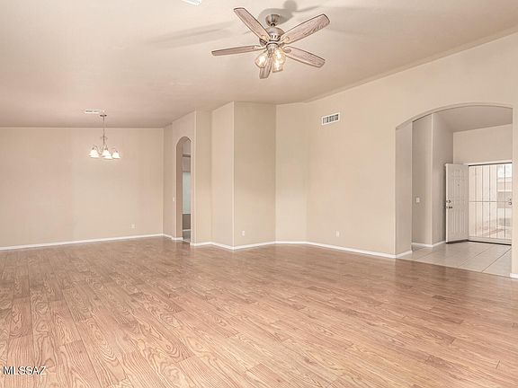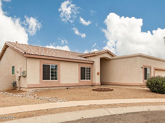 Refined living in The West at Rita Ranch, on a peaceful cul-de-sac within Vail School District. 3-bedroom, 2-bath home w/ den seamlessly blends modern elegance w/ sustainable living. Abundant natural light illuminates throughout. Tile & wood-look flooring grace living areas, while plush carpet warms the bedrooms. Open living & dining spaces flow effortlessly outdoors through French doors. The gourmet kitchen features premium Cafe brand oven & dishwasher, stainless appliances, hands-free faucet, & breakfast nook w/ bay window. The den provides ideal flex space. The primary suite offers patio access, walk-in closet, 2 additional closets & spa-inspired ensuite w/ dual vanities & separate tub/shower.Private backyard w/ sparkling pool & fruit trees. Owned solar panels for energy savings!