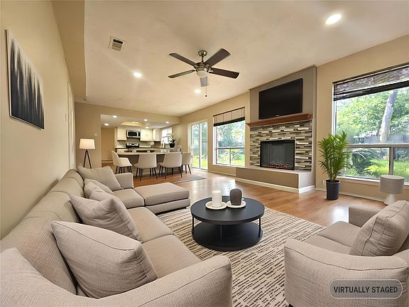 Welcome to this fabulous 2-story, 4 BR, 2.5 bath home to call your own! Fresh paint throughout. Family room has recessed lighting, ceiling fan, new electric fireplace w/mantle & display base. Natural lighting embodies the black & white kitchen décor, lots of cabinets for storage, breakfast bar, marblelike laminate countertop, electric range/oven, dishwasher and microwave. Dining/Living room combo is great for entertaining. Double doors open to private master suite with walk-in closet. Master bath has newly installed dual midnight blue vessel glass sinks, and soaking tub with shower. Secondary bedrooms are spacious w/ceiling fans. Upgraded sliding glass doors provide access to balcony in two secondary bedrooms. The secondary bathroom has double sinks and shower/tub combo. A new sliding glass door opens to the large backyard. Nest thermostat and doorbell. Zoned to Fort Bend ISD schools. Convenient to Houston Community College, local restaurants, shopping, airport and medical center.