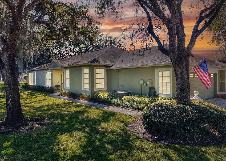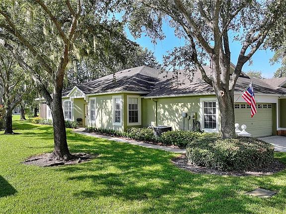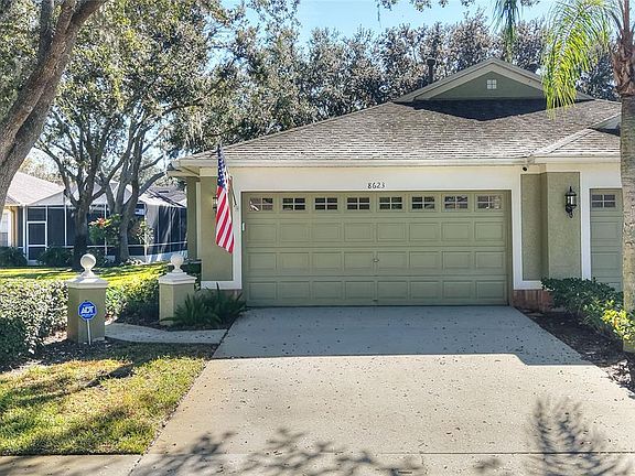 One or more photo(s) has been virtually staged. Beautifully updated villa in the desirable, gated community of Doves Landing in West Meadows offering maintenance-free living and an array of recent upgrades. This 2-bedroom, 2-bath home with a versatile Den/possible 3rd bedroom features new flooring, new blinds/sliders with remote-control rollers in both bedrooms, a newly enclosed patio, refreshed landscaping, new light fixtures and ceiling fans, and all-new stainless steel kitchen appliances including range, microwave, refrigerator, and dishwasher. Additional enhancements include a new garage motor with a 5-year warranty (2024), new garage opener, installed ring doorbell, motion sensors and three additional outdoor cameras. The den/3rd bedroom is enclosed with French doors and includes a full wall closet, offering flexible use for an office or guest space. The kitchen offers white cabinetry, ample counter space, a closet pantry, breakfast bar, laminate flooring, and a sunny breakfast nook. The spacious primary retreat includes a tray ceiling, walk-in closet, and an ensuite bath with dual vanities and a large walk-in shower, while the secondary bedroom and bath are positioned for privacy. Sliding glass doors open to a screened lanai with peaceful water and conservation views. HOA maintenance covers exterior painting, roof, lawn care, community pool, private roads, and escrow reserves. Residents of Doves Landing enjoy their own private pool plus full access to West Meadows resort-style amenities including a clubhouse, fitness center, lap and resort pools with a water slide, splash pad, tennis, volleyball and basketball courts, soccer and baseball fields, dog parks, and scenic walking/jogging trails. Conveniently located near I-75/I-275, USF, VA Hospital, Moffitt Cancer Center, Tampa Premium Outlets, Shops at Wiregrass, dining, hospitals, and entertainment. Roof replaced by HOA in 2014 and exterior painted in 2020. Welcome home! WASHER AND DRYER DO NOT CONVEY WITH THE SALE OF THE PROPERTY