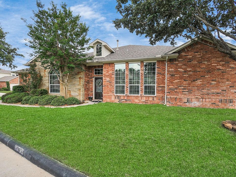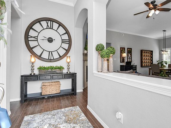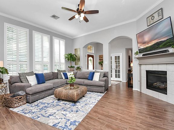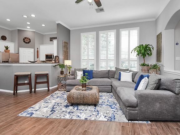 Stunning 3-bedroom, 2-bath furnished home in the prestigious gated community of The Retreat at Gleannloch Farms. This immaculate residence features plantation shutters, crown molding, and soaring ceilings that enhance the spacious split floor plan. Elegant architectural archways and a French door study ideal as a home office, reading nook, or optional third bedroom add to the charm. Wood-look tile flooring flows seamlessly throughout the home. The gourmet kitchen boasts LG stainless steel appliances, 42-inch cabinets, granite countertops, and a breakfast bar that opens to the living area, blending style and comfort. The serene primary suite offers a walk-in closet and a luxurious remodeled shower built for two. Enjoy peaceful moments on the charming back patio surrounded by lush landscaping, and appreciate the epoxy-finished floor in the 2-car garage. Experience effortless elegance and low-maintenance living in this exceptional home!