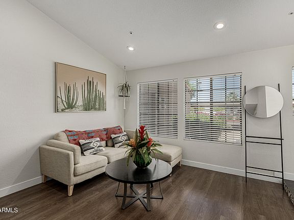 Nestled in South Scottsdale, this fully renovated 2 bedroom, 2 bathroom townhome showcases updated flooring, paint, countertops, shower, and lighting. Not a stone left unturned! Its lofty ceilings and ample sunlight create a tranquil ambiance. Upstairs, the primary suite offers a secluded en suite, private balcony and walk-in closet, while downstairs presents a flexible second bedroom or office. The kitchen boasts granite countertops, stainless steel appliances, updated cabinetry and overlooks a spacious living/dining area. Residents can enjoy the community's inviting pool and spa. Situated close to Old Town Scottsdale, Sky Harbor Airport, El Dorado Park, and the 101 and 202 freeways, convenience is at your doorstep.
