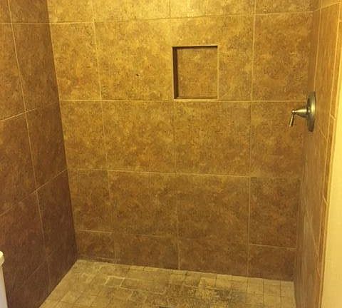 Travertine tile in living room and Alder cabinets in kitchen.
