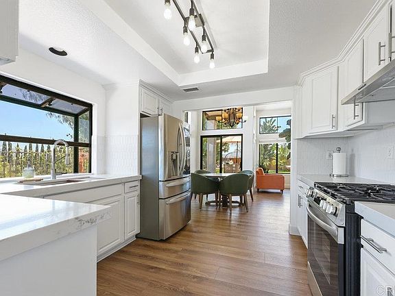 Perched at the end of a peaceful cul-de-sac in the hills of Santee, this beautifully updated 4 bedroom home offers breathtaking panoramic mountain and valley views - with more than 180° of unobstructed scenery. This home is a true retreat, offering unmatched privacy inside and out. You'll love the mature, low-maintenance landscaping, new fencing, entertaining area, and brand-new 2023 Astroturf for year-round beauty and convenience. Inside, discover a thoughtfully remodeled interior boasting vaulted ceilings, new flooring, baseboards, and fresh paint throughout. Renovated kitchen (2023) features new countertops, backsplash, deep sink, high-end faucet, garbage disposal, 2025 gas range, and a sleek LG touch-light fridge with exterior beverage door. There’s space for entertaining with separate living and family rooms, dining space, and a downstairs guest room. The primary suite is a sanctuary with sweeping views and a renovated ensuite bath including a modern vanity, glass-enclosed walk-in shower, Moen fixtures, and new toilet. The upstairs hall bath has also been updated with a new vanity, toilet, and Kohler fixtures. Additional highlights include: Newer AC and tankless water heater, upgraded lighting throughout, ceiling fans in every bedroom, excellent storage, great community with low turnover. The HOA amenities include a pool, Jacuzzi, cabana, basketball court, and green spaces—perfect for relaxing or socializing. Located just 5 minutes from highways 52, 125, and 67, and only 20 minutes to La Jolla, Pacific Beach, Ocean Beach, the airport, and downtown San Diego. With over $65,000 in recent upgrades since 2022, this home offers the perfect blend of modern comfort, community charm, and unbeatable location. Zoned for highly rated Santee and Grossmont school districts, and positioned to capture a daily cross breeze and holiday fireworks shows, this is the rare property that truly has it all!