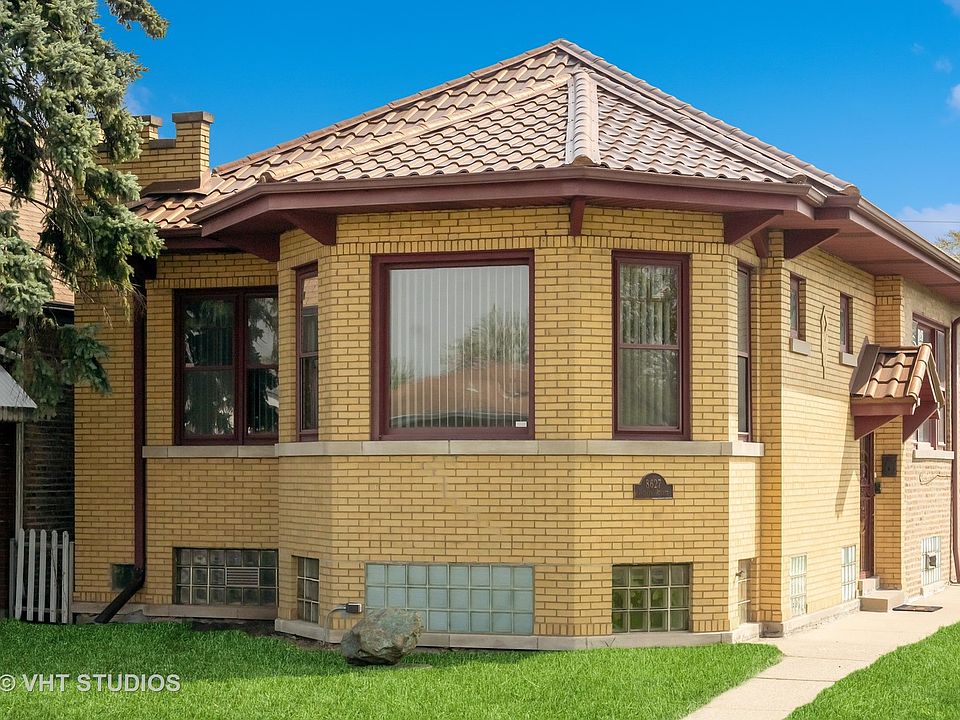 Welcome to this captivating Chicago Bungalow nestled on picturesque Indiana Avenue - a true oasis in the heart of Chatham, where neighborhood pride is everywhere! Fashioned in the esteemed Prairie architectural style, this brick home exudes quality and craftsmanship, featuring a distinctive octagon front and north wing. Step inside to discover impeccable wood flooring with a stunning Parquet entrance, complimented by a cozy decorative fireplace, lofty ceilings, Crown moldings, and abundant natural light pouring in through expansive windows. The main floor offers a spacious layout with an open Living room and den, separate dining room, and a modernized kitchen with quartz countertops. Three generous sized bedrooms and two full baths provide ample space for comfortable living. Below, the lower level awaits your creative vision with a bedroom, full bathroom, kitchen, office, and family room. Outside, two exquisite original stained-glass windows adorn the exterior, while a sprawling deck with built-in seating, a brick paver patio, and a fire pit is the perfect setting for outdoor gatherings. Stunning roof has a transferable lifetime Warranty. Seize the opportunities to transform this wonderful home with your unique style. Use the expansive side lot of over 4800 sqft included in this remarkable offering to Build Historic Wealth! - PERFECT LOCATION... BOUNDLESS POSSIBILITIES.