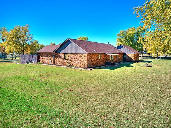 Immaculate corner acreage in an established neighborhood. This property has been well kept by the same owner for more than 30 years. Pride in ownership really shows! The home has had a huge renovation including new Luxury Vinyl Floors, paint, water softener, lighting & fans, sinks & fixtures, granite, and G.E. Profile appliances. The living room is large with cathedral ceiling, wet bar, built-in bookcases, and a beautiful rock fireplace with an insert to feel cozy in the winters. There is an abundance of natural light throughout the home. Everywhere you look, there is more storage area. Two bedrooms have a Jack-and-Jill bathroom attached. The Master bathroom has a walk-in closet along with a wall of drawers & cabinets. The whirlpool tub is perfect for relaxing. The laundry room has lots of storage and a large folding shelf that can be folded down for more space. Outdoors, you will find a large new patio leading to the sparkling, above-ground pool with its brand new liner and a full deck all the way around. It is also completely fenced for privacy and safety. Behind the pool, you will find a large fenced dog run. Don't miss the HUGE, ~1,756 sf outbuilding with plumbing & electric. It could be a perfect apartment or guest house. It is already equipped with a sink, toilet, bathtub/shower, washer hookups, and its own hot water tank. Window units and ceiling fans are included as well. You will find space to park your RV and another garage for a vehicle. There is also a loft area with even more storage. Behind the home is an in-ground storm shelter with its own building around it. Beautifully landscaped and ready to become your own homestead. Completely fenced and chickens & livestock are allowed. Don't miss this Beauty!