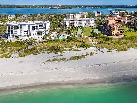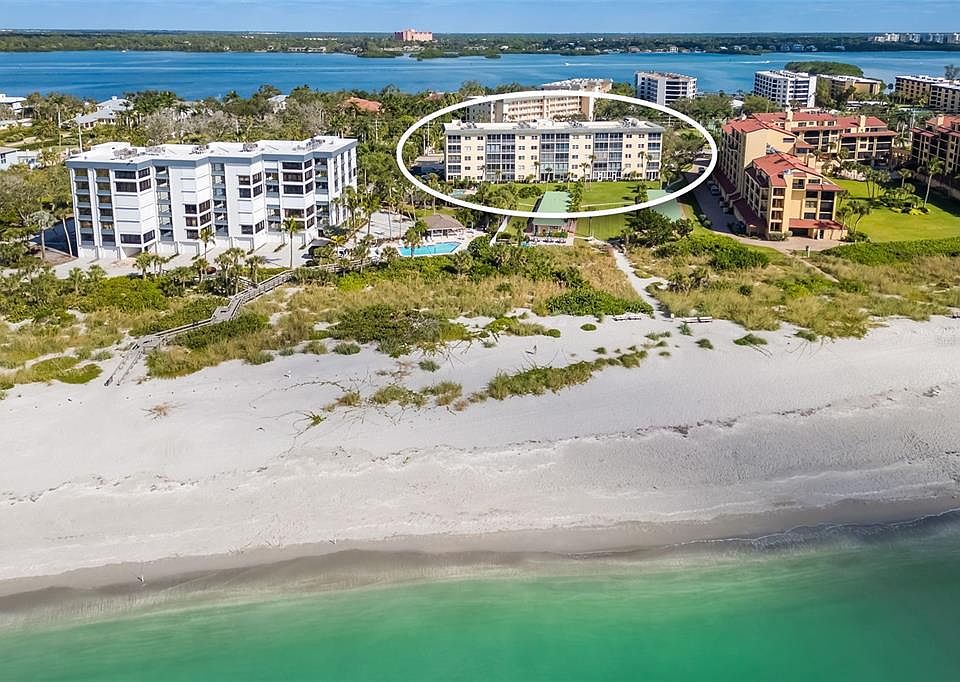 NO FLOODING from hurricanes! Not a drop! This ground floor beach front condo did not get any damage from last year’s storms! Bay Tree Club is an extremely popular community on the south end of Siesta Key and there was no damage to any of the 120 condos in this well managed and maintained community and remains in HIGH DEMAND. This immaculate and easy accessible end unit directly on the gulf is STUNNING with upgrades galore. Sellers have spared no expense expanding their living space and have Installed hurricane impact glass throughout this customized condo. Upon entering, you’ll notice the beautiful solid wood white cabinetry in this spacious kitchen with superior stainless steel appliances including a farmhouse sink. The timeless and classic high polished granite that covers this kitchen is beautiful and was also creatively used to customize a 10 foot built in dining room table. And for added convenience and function, designated work space sits at the front of kitchen next to another point of entry with sliding glass doors, where your designated parking space is located. Primary light filled en-suite bedroom features a French door entry, gorgeous bathroom, and large closet. Behind a big white sliding barn door, you’ll find the guest bath and the secondary bedroom, which has a large and extremely comfortable but still cozy built in bench/sleeping area that features tons of storage beneath giving incredible space and function to this room. Luxury wood plank tile throughout entire condo offers a timeless appeal. Unique to this community are private storage cabanas right off the beach where each owner has their own designated space to keep their e-bikes, beach chairs and other essentials. For added convenience to owners and guests, restrooms are also located directly off your pristine private access to the best location on Turtle Beach. Bring your boat too, as this is a gulf and bay community with superior Trek decking docks. There are BBQ areas and heated pools on both sides of this beach and bay community. The Siesta Key beach trolley stops immediately in front of Bay Tree Club for hop on/hop off free transport to the island’s beaches and to both enormously popular North and South Villages and runs all day up and into the night. This pet friendly community is ideal for a second home or an investment property, permitting one month minimum rentals January through April, and 2 weeks the remaining 8 months of the year. Make no mistake- this corner unit on the gulf side can boast a high-end renovation with premium finishes and is in an exceptional location. The unit has a rental in place for February 2026, that must be honored.