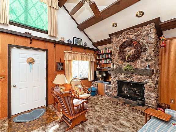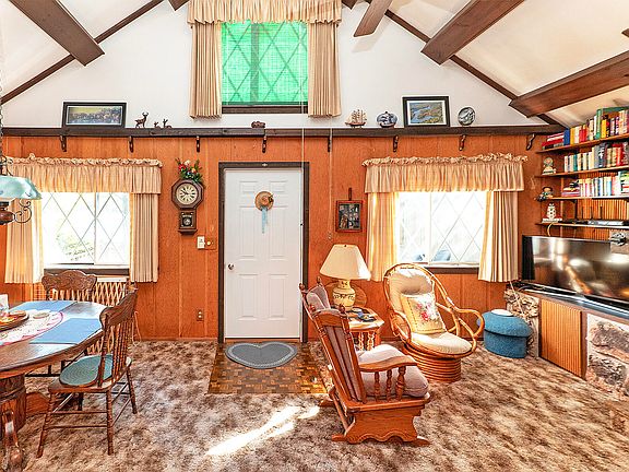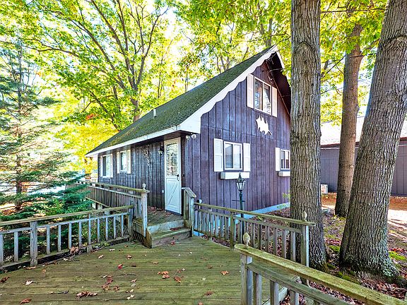 Nestled on 123 feet of pristine lakefront, this charming A-frame home offers the perfect blend of rustic elegance and modern comfort. With cathedral ceilings and a stunning floor-to-ceiling stone fireplace, the open-concept living space exudes warmth and character. The 2-bedroom, 1-bath layout is thoughtfully designed to maximize lake views, and a full walk-out basement provides ample opportunity for expansion or recreation. Step outside onto the expansive wrap-around deck—ideal for entertaining or simply relaxing while taking in the panoramic views of the all-sports lake and sandy beach shoreline. Beyond the home, a spacious two-car, two-story garage offers abundant storage, including a large upper level that could be finished into a studio, guest suite, or workshop. Whether you're looking for a year-round residence or a weekend getaway, this lakefront gem delivers the perfect lifestylepeaceful mornings by the water, fun-filled afternoons on the lake, and unforgettable evenings around the fire.