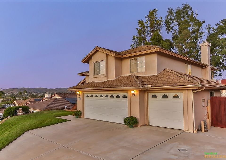 Beautiful 2-story home with mountain views in Santee! ***Large, elevated lot! ***No HOA or Mello Roos! ***Entertainers backyard has immaculately maintained landscaping, huge elevated pergola with a custom water feature and swing, covered patio with speakers and lights, and a high fence for added privacy. ***Light and bright home with tons of windows allowing natural light to flourish. ***Entry level bedroom could easily become a great home office. ***Spacious family room off the kitchen with a fireplace. ***Large kitchen has recently updated appliances, tile flooring, and tons of cabinet space. ***Master suite has a huge private balcony with a remote controlled awning and a spiral staircase to the backyard. ***Whole house fan. ***Water softening system. ***Laundry room with sink and extra storage. ***Quiet neighborhood but close to dining, major shopping, schools, and freeway access.