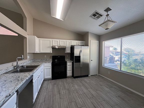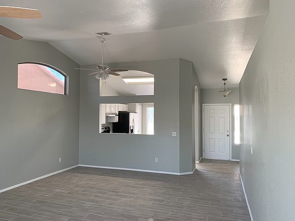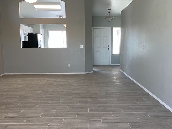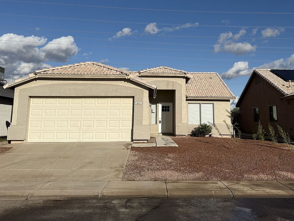 This home has a large open floor plan with neutral tones and tile flooring throughout.....it's bright and clean. A spacious eat in kitchen with a pantry closet and stainless steel appliances, the kitchen opens to the great room. Master bedroom has a large walk-in closet with built in shelves for storage and nice long vanity counter in the bathroom. 2 guest bedrooms and 2 car garage. Gravel and turf in the back-New AC installed in 2025. Quiet street with no neighbors behind you!