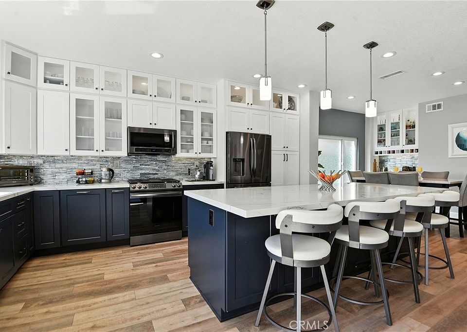 The home underwent a fully permitted transformation in 2021, opening downstairs into a seamless layout that flows from the kitchen to the dining and living areas. The redesigned kitchen features all new cabinetry with in-cabinet and under-cabinet lighting, quartz counters, a large center island, stainless steel appliances, and a reverse osmosis drinking water system. The dining room includes a built-in bar, creating an ideal space for both everyday living and entertaining.
