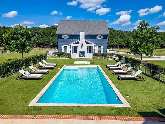 Hamptons-inspired elegance meets relaxed Texas living on this breathtaking 10± acre ag-exempt estate located just 18 miles from downtown Fort Worth in Aledo ISD. Behind 2 private gates, the property unfolds into a serene, tree-lined retreat with 2 beautifully designed residences, resort-style outdoor living, and thoughtful amenities at every turn. The 5,130± SF main home features 5 spacious bedrooms, 4.5 baths, and multiple living and entertaining spaces. A wall of glass upon entry offers a stunning view of the acreage beyond, while the chef’s kitchen delights with handcrafted Quartzite apron-front sinks, Aga appliances, and an oversized island with bar seating and an ice maker. Seamless transitions between indoor and outdoor spaces create the perfect backdrop for entertaining, whether gathered around the fireplace on the vaulted covered porch, relaxing on the screened-in porch, or soaking in the modern pool and spa surrounded by an AstroTurf yard and lounge seating. The 2,400± SF guest house offers incredible flexibility with a full kitchen downstairs, kitchenette upstairs, and 4 bedrooms—ideal as a pool house, private apartment, or guest quarters. A detached 285± SF studio offers the perfect space for an office, gym, or creative retreat. With four laundry rooms, two separate 2-car garages, wells and water filtration systems, and a buried propane tank, every detail has been designed with comfort and convenience in mind. The property is cross-fenced and plumbed for livestock, with mature trees offering a peaceful, natural buffer at the back of the acreage. Gas lanterns flicker at sunset, front porch swings invite you to linger a little longer, and the sight of horses grazing in the distance brings a touch of timeless Texas charm. A rare opportunity to own a legacy estate where classic design and modern comforts exist in perfect harmony.
