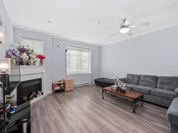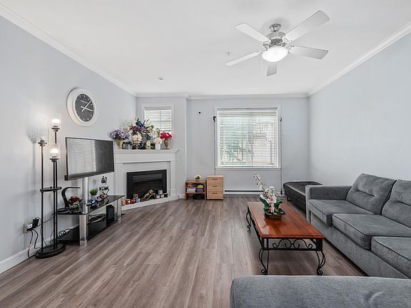 Quiet inside unitFine finishingCozy fire placeRich laminate floorCrown mouldingMaple cabinetsBalcony off kitchen