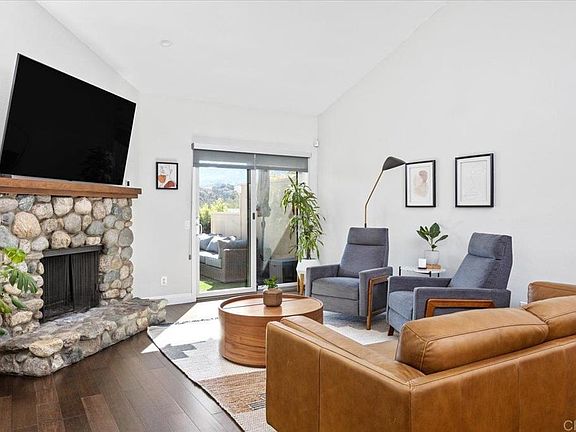 Step into this beautifully updated, single-story, 2-bedroom, 2-bathroom condo that exudes modern charm and high-end finishes. Located near Castle Creek Golf Course, this home has been thoughtfully renovated to offer a blend of comfort, functionality, and luxury. Key upgrades include new windows and a sliding glass door leading to the patio, where you'll find upgraded 220v electrical outlets, perfect for a spa or additional lighting or outdoor appliances. The updated kitchen features refreshed cabinets, a newer sink and faucet, modern lighting, and upgraded flooring throughout (installed in 2018). A chic dining chandelier brings warmth and elegance to the dining space, and new artificial turf was installed in the back patio for a lush outdoor retreat. The primary bath is a sanctuary with dual sinks, a walk-in shower with dual showerheads, and a spacious walk-in closet complete with custom organizers. Plantation shutters provide stylish privacy. With vaulted ceilings, a cozy stone fireplace and upgraded skylights that flood the space with natural light, this condo is both welcoming and impressive. The south-facing backyard patio offers captivating mountain views, creating a serene outdoor escape.