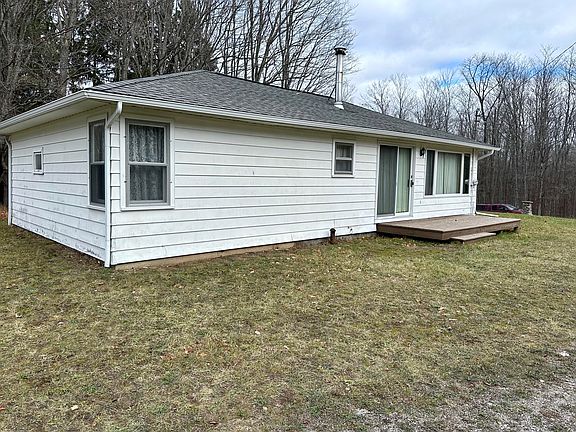 Financing Fell Through—Your Gain! Seize This Second Chance To Make This Home Yours. Charming 2BR, 1BA home with natural gas heat and a basement offers comfort and convenience. Features include a detached 24x30 garage with a bunkhouse and a half-bath loft, perfect for guests or as a workspace. The property boasts a 40x42 pole barn with 14' high sidewalls and a cement floor, ideal for hobbies or storage. Surrounded by nature, the yard with apple trees attracts deer, offering lots of privacy. An added perk is its proximity to state land across the street, providing endless outdoor activities without the tax burden. A serene retreat with ample space for recreation and relaxation