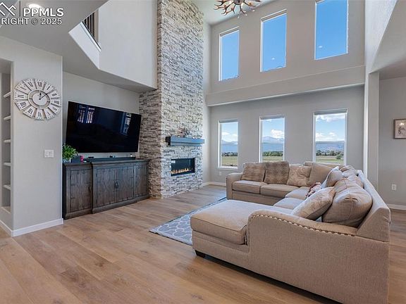 Breathtaking mountain views & a setting that backs to open space make this home truly one of a kind. From the moment you arrive, the scenery takes center stage & continues to impress throughout the entire property. Nestled on a large, newly landscaped lot with added fencing & mesh, this residence combines modern design with thoughtful upgrades, creating a home that is as functional as it is beautiful. Soaring ceilings & expansive windows highlight the views while filling the home with natural light & a dramatic floor-to-ceiling fireplace anchored by elegant chandeliers sets the tone in the great room. The gourmet kitchen is designed for everyday living, featuring quartz countertops, upgraded cabinetry, a walk-in pantry, custom backsplash, modern faucet, & a spacious island that flows seamlessly into the dining & living areas. A versatile front room adds flexibility, whether used as a formal dining space or a cozy sitting area, while the main-level office provides the privacy needed for work or study. Upstairs, the primary suite serves as a relaxing retreat with stunning mountain vistas, a spa-inspired bathroom enhanced by smart mirrors, & a generous walk-in closet. Secondary bedrooms are equally spacious & bright, complemented by well-appointed bathrooms, & an upper-level catwalk enhances the architectural appeal while overlooking the living area below. The unfinished basement presents endless possibilities for future expansion, from a home theater to a fitness room or additional living space. Outdoor living is just as impressive, with a large deck perfectly positioned to capture Colorado’s sunsets & mountain views, while the beautifully landscaped backyard is designed for both recreation & relaxation, making it a space to enjoy year-round. Additional upgrades include window well covers, a suite of blinds with motorized options, security cameras with a doorbell camera, & insulated garage walls with utility racks & a slate wall system for added organization.