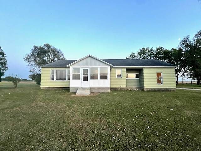 Back door entrance leads to attached one car garage with attic access. Kitchen: Hard wood floors, white painted walls with wainscoting, built in shelving, separate counter perfect for a coffee bar, stove and refrigerator (new in 2023) included. Pantry/Laundry Room: Carpet, closet, paneling with wainscoting. Potential for 3rd bedroom. Enclosed front porch: Cement floor, ceiling fan, paneled walls and ceiling, thermopane windows. Perfect for watching sunsets and the cars go by. Living Room: Hard wood floors, decorative fireplace with z-brick covering, 2 walls are paneled and 1 painted. Bedroom: Hardwood floor, ceiling fan, painted walls, closet. Bath: Ceramic tile, cove molding, vanity, linen closet, commode, shower, ceiling fan. Bedroom: Carpet, ceiling fan, cove molding, closet and cubby for extra storage. Basement: Block basement houses GFA/CAC, water heater. HUGE shed: 32' x 55' (1760 sq ft) with electricity, cement floor, 2 south side doors are motorized, 2 north side doors are roll up. There is plenty of room for gardens, swing sets, or even your own mini farm!