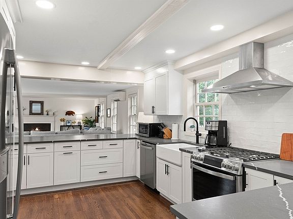 Exquisite Gambrel sited on 1.85 private acres set far back on Bay Road. Hard to find a home so unique. Enter through the Dutch door and find a sun filled bright entryway with brand new kitchen (2023), gas cooktop, pantry and eat-in area, dining room with French doors, large fireplaced living room with windows all around and double doors to blue stone patio and firepit area. In addition, the first floor has a large family room (could be converted to a 1st floor master if a closet is added)with full bath steps away. There is a home office with bookcases/desk all built in. On the second floor there are 3 large bedrooms. Primary bedroom has built-in's and lots of closets nearby with washer/dry area. There are two additional full baths upstairs with guest bedroom ensuite. Five zoned forced hot water heating system and hot water tank (2017),new air conditioning (6 mini splits 2022),interior fresh paint, new blow-in insulation in the attic. The exterior is pristine and a gardeners paradise!