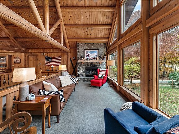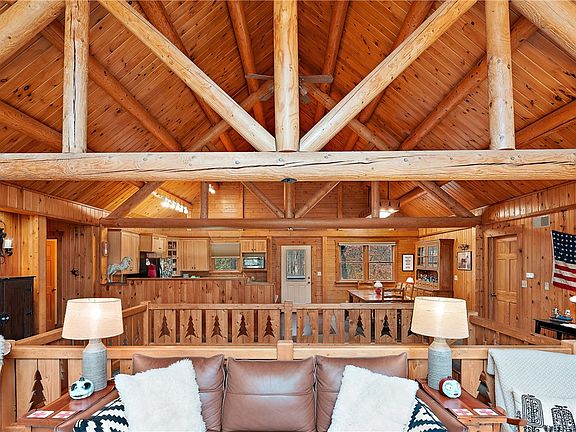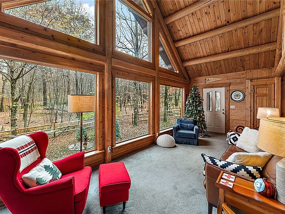 Enjoy the serene beauty of the Laurel Highlands just minutes from the Hidden Valley and Seven Springs Ski Resorts! This remarkable log cabin is just steps from the Laurel Highlands Hiking Trail and the snowmobile trails, making it a haven for outdoor enthusiasts. Inside you'll find soaring cathedral ceilings, exposed beams, and a grand stone fireplace that creates a dramatic focal point. Expansive windows fill the open living space with natural light and forest views. The home offers four spacious bedrooms and three full baths, including a tranquil en suite primary retreat. The finished lower-level provides an ideal space for relaxing. Step outside to the private deck with a hot tub overlooking the large, fenced-in yard. A two-car garage and the large detached garage offer ample storage. Modern updates include newer HVAC system and hot water heater. Whether as a full-time residence or mountain getaway, you can experience the best of Western PA’s mountain lifestyle in style and comfort.