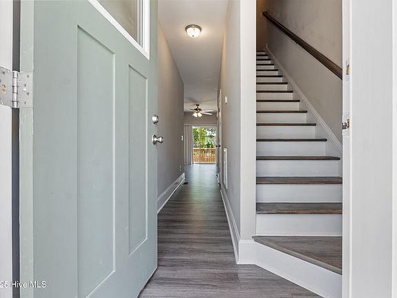 Downstairs, you'll find an open living, dining, and kitchen area that makes it easy to cook, relax, and entertain. The kitchen features stainless steel appliances and plenty of counter space. There's also a convenient half bath on the main floor for guests.
