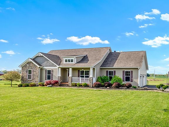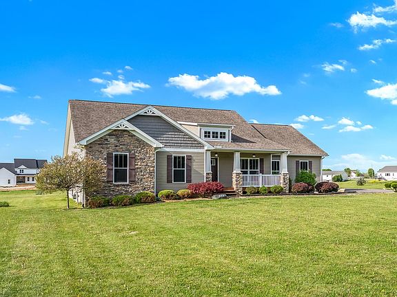 Country living.....city close! This beautiful and spacious custom-built ranch is situated on 2+ acres just minutes from downtown Delaware and offers 2200+ sq. ft., 3 BR's with walk-in closets, 2 full bathrooms, den/optional 4th BR and convenient 1st flr laundry! The first floor features an open concept with vaulted great room open to kitchen/dining areas and cozy wood-burning stone fireplace. Other special amenities include Mohawk laminate flooring, upgraded lighting throughout, Amish made maple cabinets and granite in kitchen and both baths, full basement plumbed for 3rd bath (framing, toilet and vanity materials included), covered front porch, covered rear deck to enjoy Summer days/nights, 3-car side-load garage, and a separate storage shed too!