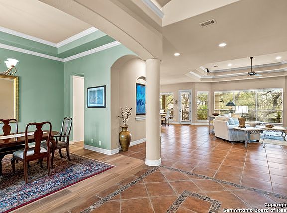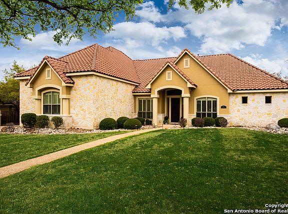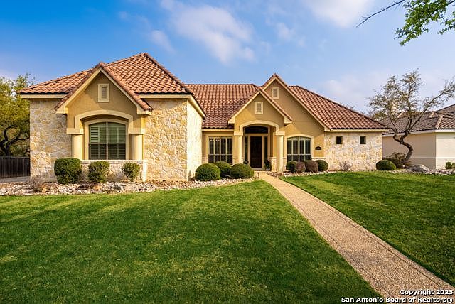 $10K Decorator Allowance to use at buyer's discretion. Explore this opportunity to own a newly updated 4 or 5 Bedroom | 5 Full Bath | 3 Car Garage, 1 1/2 story home, in one of North San Antonio's most premiere Golf Course communities. The sanctuary is nestled behind a Guarded Gate, with Central Park (an owners park); plus, a world class Amenities Center and Private Golf Club (memberships available), located just outside. Relax year-round on the large, covered patio, surrounded by lush landscaping with a bubbling Waterfall Pond that completes the private garden-like yard. All, with the added perks of Reagan High School, and No City Taxes. The primary bedroom features a luxurious bath with an oversized walk-in shower, large jetted tub, double vanities, an ample closet, and retractable black-out shades. The home is built for entertaining with a large formal dining room and flex room. Live well under impressive barrel and tray ceilings. Imagine galley lighting, custom cabinets, a gourmet island kitchen, breakfast bar, and a breakfast room that pour into the grand room, where a corner rock fireplace soars to the high ceiling above, plus 2 secondary bedrooms on the first floor, for all your guests. All bedrooms enjoy their own full en suite bath. The half story upstairs, is a suite of its own, with a large living area, bedroom, and full bath. Other savvy architectural elements include a mud room/study room leading from the garage to the kitchen, and a downstairs cabana bath opening to the back patio; ideal for a swimming pool the new owners may add. Storage abounds with the attic wrap-around, encircling the upstairs game room. Top notch area amenities include boutiques, restaurants, shopping, entertainment, and direct airport access. 4110 SF. Office is 5th bedroom/flex room. Ask for extensive list of recent improvements. Supremely well maintained, with service records available.