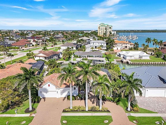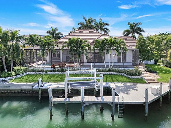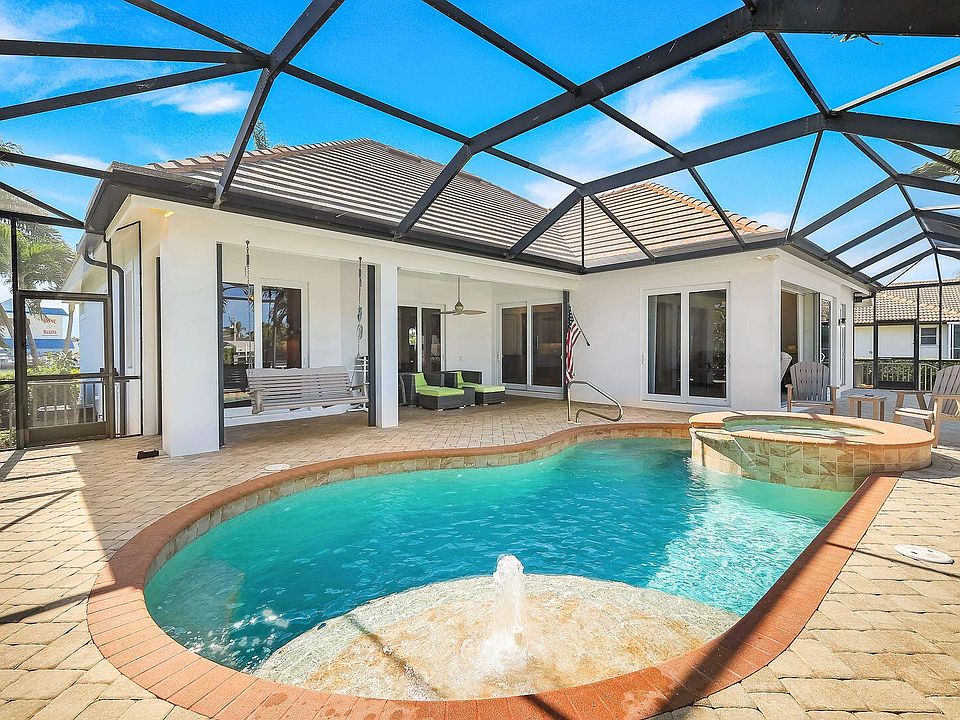 Where timeless design meets the art of coastal living. Just four houses from the Marco River and Factory Bay, this meticulously renovated coastal residence of 4 Bed | 2BA | 3 Car garage: 35'x27' (deep) 4571SF Total reflects exceptional quality and refined style, capturing the spirit of island living where light, space, and water flow together effortlessly. Set on an oversized 100 x 110 homesite of .26 acres, the property, built by Arthur Rutenberg, welcomes you with a circular driveway framed by swaying palms and a distinctive double-door entry. Every architectural detail has been thoughtfully considered, from graceful arches and elegant coffered tray ceilings to the natural flow of its open living spaces. Inside, a refined coastal palette enhances the great room and chef's kitchen—complete with stainless appliances, a walk-in pantry, and generous island and peninsula seating designed for gathering, entertaining, and everyday comfort. The primary suite is a private retreat, with lanai access, dual walk-in closets, and a re-imagined spa-inspired bath with walk in shower, soaking tub, accented by designer tiling, lighting, and fixtures. While 2 more split bedrooms with a 2nd renewed designer bath, and a flex space with laundry, sink and built-in desk, may easily become the 4th bedroom or study. Step outside to the fully screened lanai and experience a private resort setting with sparkling pool and integrated spa with open and covered lounging, dining and living areas surrounded by lush tropical landscaping. A U-shaped dock with slip and 14,000-lb lift offers quick, water-direct access to the Gulf—perfect for sunset cruises or a spontaneous day on the water. (Seawall 2009). Impact glass, electric storm shutters, new A/C and fencing (2024), a grand circular drive, and deep two garages for 3+ cars with built-ins complete the picture of luxury, comfort, and confidence. Live where every detail reflects thoughtful design, enduring quality, and the effortless elegance of Marco Island's Florida lifestyle on the water.