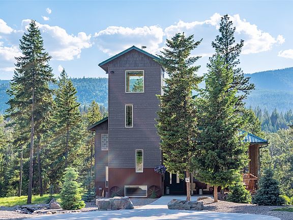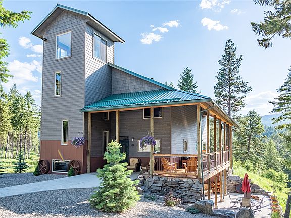 As you step inside, the main level greets you with an awe-inspiring ambiance created by floor-to-ceiling windows, a magnificent river rock fireplace, and an open-concept layout that caters to both intimate gatherings and grand dinner parties. The kitchen boasts a sophisticated rustic charm, featuring stainless steel appliances, hickory cabinetry, and floors, as well as an oversized pantry. The spacious island provides ample seating and connects seamlessly to the great room and dining area. Step outside onto the covered wrap-around deck, where you can relax in the hot tub or enjoy the cozy seating area with a gas firepit hookup, all while taking in the breathtaking views of the Cabinet Mountains and the tranquil flow of Libby Creek in the background. Venture upstairs to discover a lofted sitting area overlooking the great room, allowing the natural beauty of the surroundings to flood in through the windows. The owner's suite on this level is a true sanctuary, featuring a private balcony, a generously sized walk-in closet, and a luxurious ensuite bathroom with a soaking tub and a dual-head tile shower, providing the perfect retreat for relaxation and rejuvenation. The main level also offers a junior owner suite with its own private balcony, a spacious closet, and an ensuite bathroom. On the uppermost level, you'll find a charming tower room with a reading nook and 360-degree panoramic views.