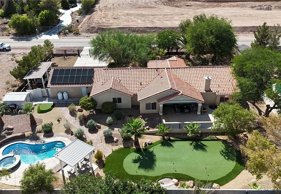 **No HOA** Welcome to 8640 Gagnier Blvd, a stunning single-story estate on a sprawling 23,000+ sq ft lot with over $200K in modern upgrades. Behind a private gated drive with RV parking, this 4-bed, 3-bath home offers seamless indoor-outdoor living. The chef’s kitchen, updated finishes, and open layout with vaulted ceilings flow to an entertainer’s dream yard featuring a heated pool & spa, expansive putting green, and unique grass area designed so you can hit wedges over the pool onto the green. Perfect for relaxing or perfecting your short game. Additional highlights include solar panels, full security camera system, a spacious 3-car garage, and a resort-style setting built for privacy and play. Rarely does a property combine elegance, function, and lifestyle at this level—your Las Vegas retreat awaits.