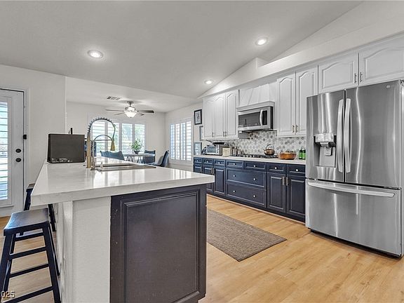 - Description: Breakfast Bar/Counter,Breakfast Nook/Eating Area,Custom Cabinets,Garden Window,Island,Man Made Woodor Laminate Flooring,Quartz Countertops,Stainless Steel Appliances,Vaulted Ceiling