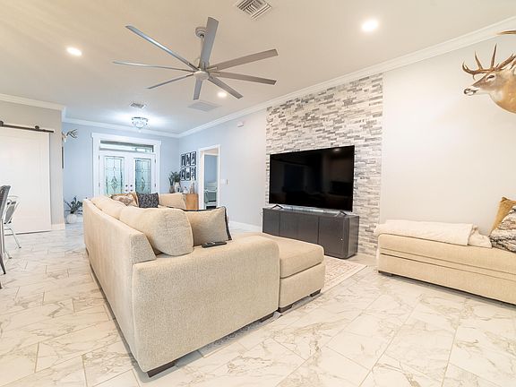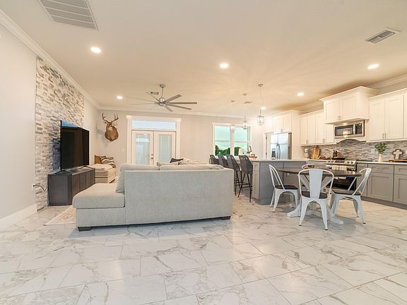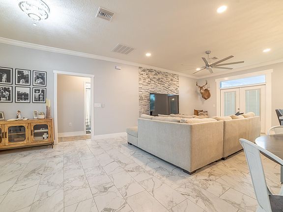 EDGEWATER ACRES ~ This 2024 CBS home on 1/2 an acre, features beautiful exterior stone detailing, a 1-car garage, & a spacious open concept layout. It boasts 1,790 sq ft of living space, & a total of 2,224 sq ft under air. This versatile home offers 4 rooms & 2 full bathrooms. You can enjoy a 3-bdrm layout w/ a dedicated dining room or a 4-bdrm configuration without a separate dining area. The kitchen features SS appliances, quartz countertops, & a large kitchen island w/ a built-in sink that doubles as a kitchen table, offering storage on both ends.The master bathroom is a true highlight, featuring a contemporary stand-alone tub, a large walk-in tiled shower, double vanity, & a walk-in closet. Throughout the main living area, you'll find elegant crown molding and chandeliers. Additional unique touches include sliding barn doors for the 4th room and French doors leading to the backyard. The hallway that connects to the garage conveniently houses a pantry and a laundry room. All measurements are approximate.