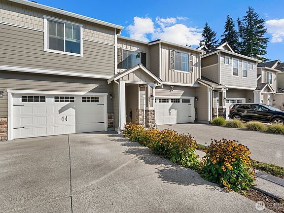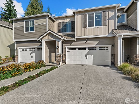 Only 1 year old and still under builder warranty! This beautifully maintained home features a gourmet kitchen with quartz countertops, a large island with breakfast bar, stainless steel appliances, and modern plank flooring throughout. The open-concept main floor flows to the covered back patio—perfect for entertaining! Upstairs includes a flexible loft space, great for an office or playroom. The spacious primary suite offers a walk-in closet and spa-inspired ensuite with glass shower and dual-sink vanity. Efficient heating and central AC for year round comfort. Located on a quiet dead-end street just steps from the community park, dog park, and basketball court. Easy, low-maintenance living in the highly rated Lake Stevens School District!