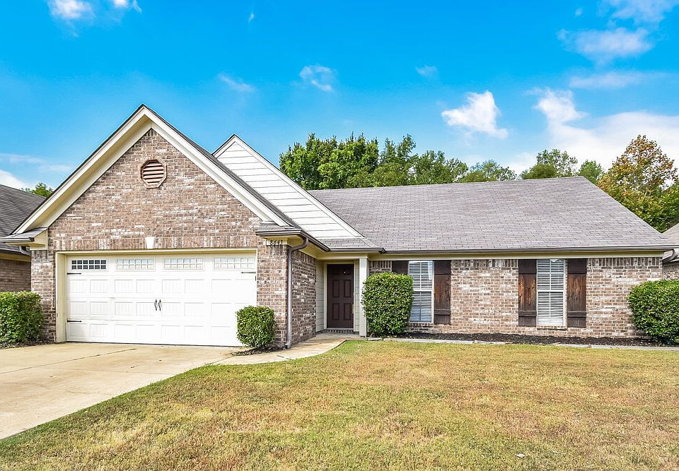Imagine living in this three-bedroom and two-bathroom rental home with a pet-friendly interior and central HVAC in Southaven, MS. This singe-story home has gorgeous hardwood flooring and an extra-high ceiling in the bright and sunny living room. Home cooks will love the eat-in kitchen. It has long quartz countertops, a pantry, and a charming bay window in the dining area. Pendant lighting hangs over the convenient breakfast bar. Soft carpeting and a lighted ceiling fan will keep you feeling comfortable in the main bedroom suite. In the en-suite bathroom, take advantage of having dual vanity sinks, and store your belongings in the suite's roomy walk-in closet. Exterior features include an attached garage and a concrete back patio. Sign up for your tour of this rental home today!