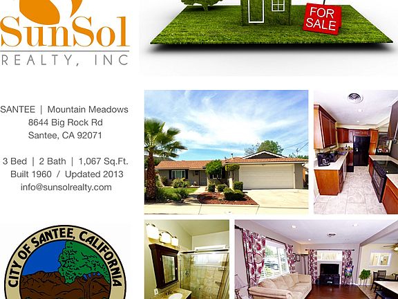This 1067 square foot single family home has 3 bedrooms and 2.0 bathrooms. This home is located at 8644 Big Rock Rd, Santee, CA 92071.