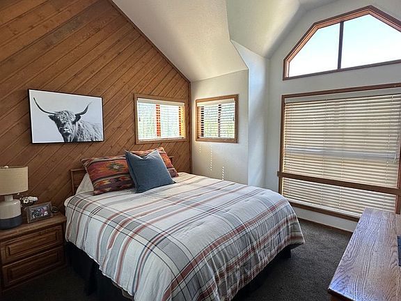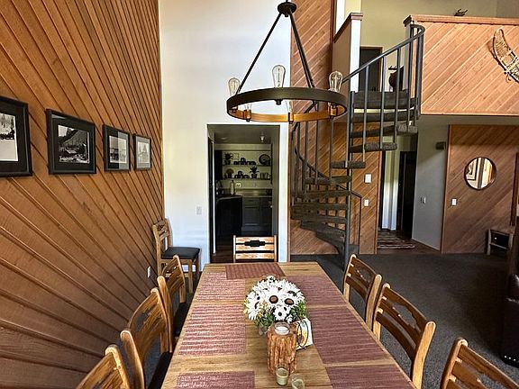 Step inside to soaring vaulted ceilings, wood-paneled accents, and a bright, open-concept living and dining area. A dramatic spiral staircase leads to the loft, ideal for extra sleeping space or a second lounge area. Large windows frame stunning mountain and forest views, filling the home with natural light.