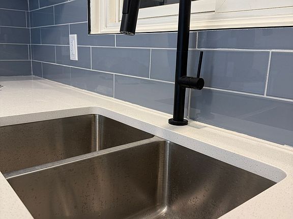 - Fully renovated kitchen featuring a quartz countertop, large double-basin sink, and brand-new appliances (refrigerator, dishwasher, and range)