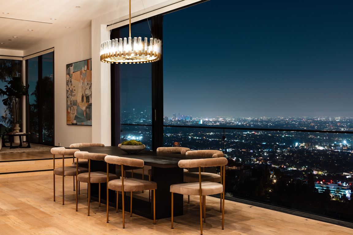 Showcased above the world-famous Sunset Strip, this modern masterpiece captures jaw-dropping panoramic city views through floor-to-ceiling glass walls. Situated on a rare double lot, the home exudes sophistication with French White Oak floors, Italian marble, and an open layout designed for seamless indoor-outdoor living. The updated chef's kitchen with Wolf appliances ...